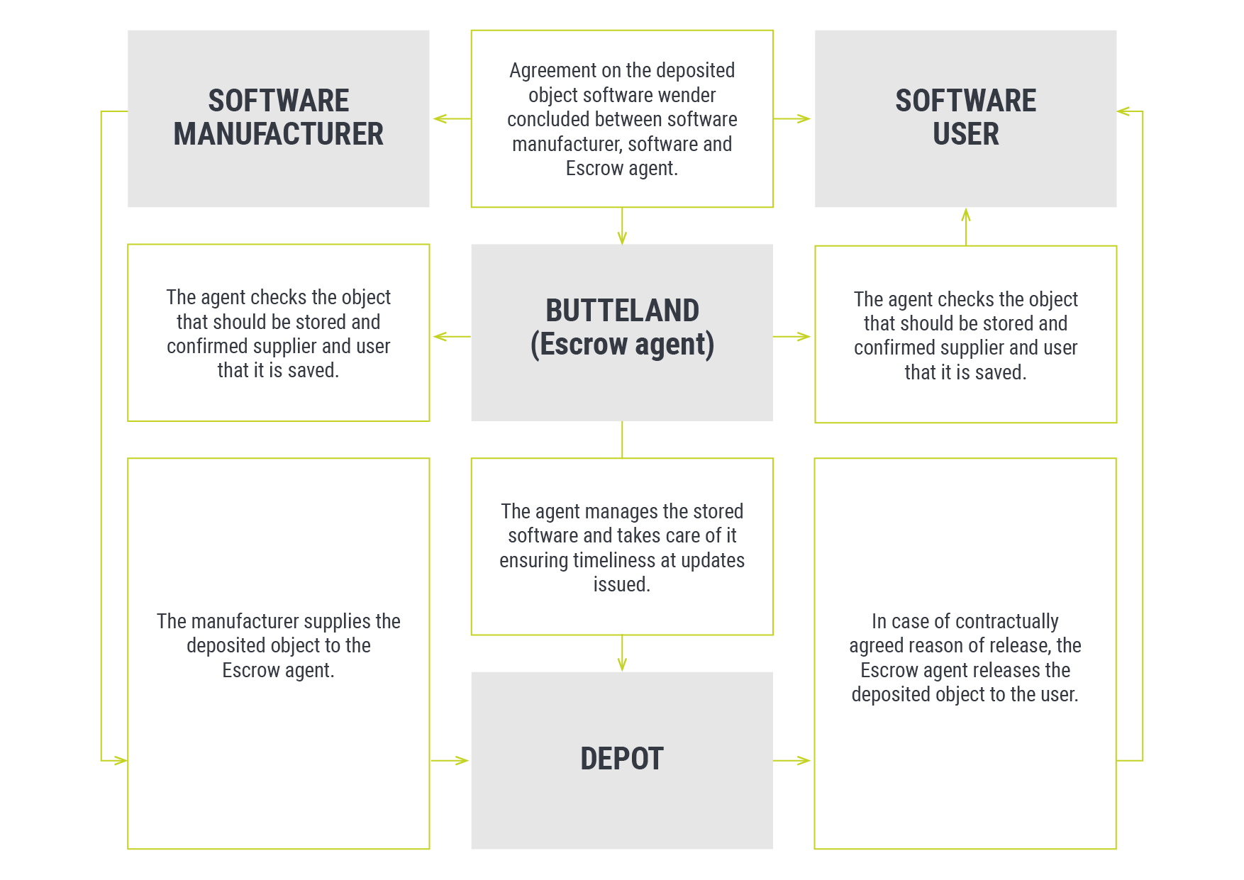 Solution for developers and publishers to securely store the software source code during the contractual period and makes it available to the user under contractually stipulated terms. Thus, the user can continue using, maintaining, and updating essential software programs to maintain business continuity, provided that the software developer cannot or doesn’t support the software anymore.